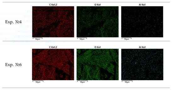 The purpose of the first experiment was to work out and calibrate the laboratory equipment. The results of the energy-dispersive analysis (EDS) showed the presence of C (carbon), 56.03%; O (oxygen), 43.28%; Al, Si, S, and Ca, below 0.5% in total. The presence of Si, S, and Ca is most likely due to residual contaminants that remained on the laboratory equipment from previous studies. In all subsequent experiments, only C, O, and Al were found (Table 5), indicating that the composition of the particles is mainly C (carbon) and O (oxygen), which is typical for diesel engines and the formation of soot during incomplete combustion of fuel. The presence of Al (aluminum) in all samples is within less than 0.1–0.3% by weight. The lack of a trend of increasing or decreasing Al depending on the engine load excludes the possibility of mechanical wear or destruction of components in the engine. Therefore, we accepted aluminum as a technical background present in all samples, which does not affect the main conclusions regarding the morphology and chemical nature of the soot. Table 5 presents a summarized trend from all six samples in the experiment and the SEM/EDS analysis.