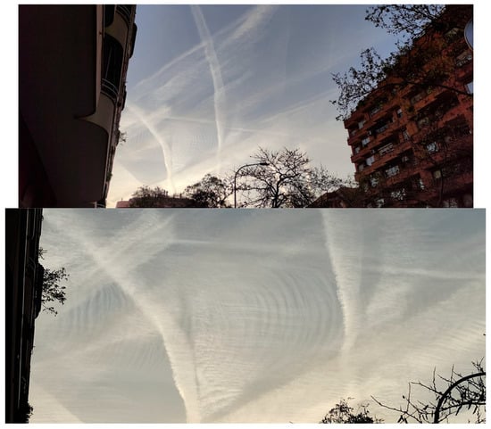 Figure 1 shows photographs documenting this singular cloud observation. The upper panel offers a general view of the sky sector where the cloud developed, showing several primary contrails that progressively spread into cirrocumulus and subsequently evolved into