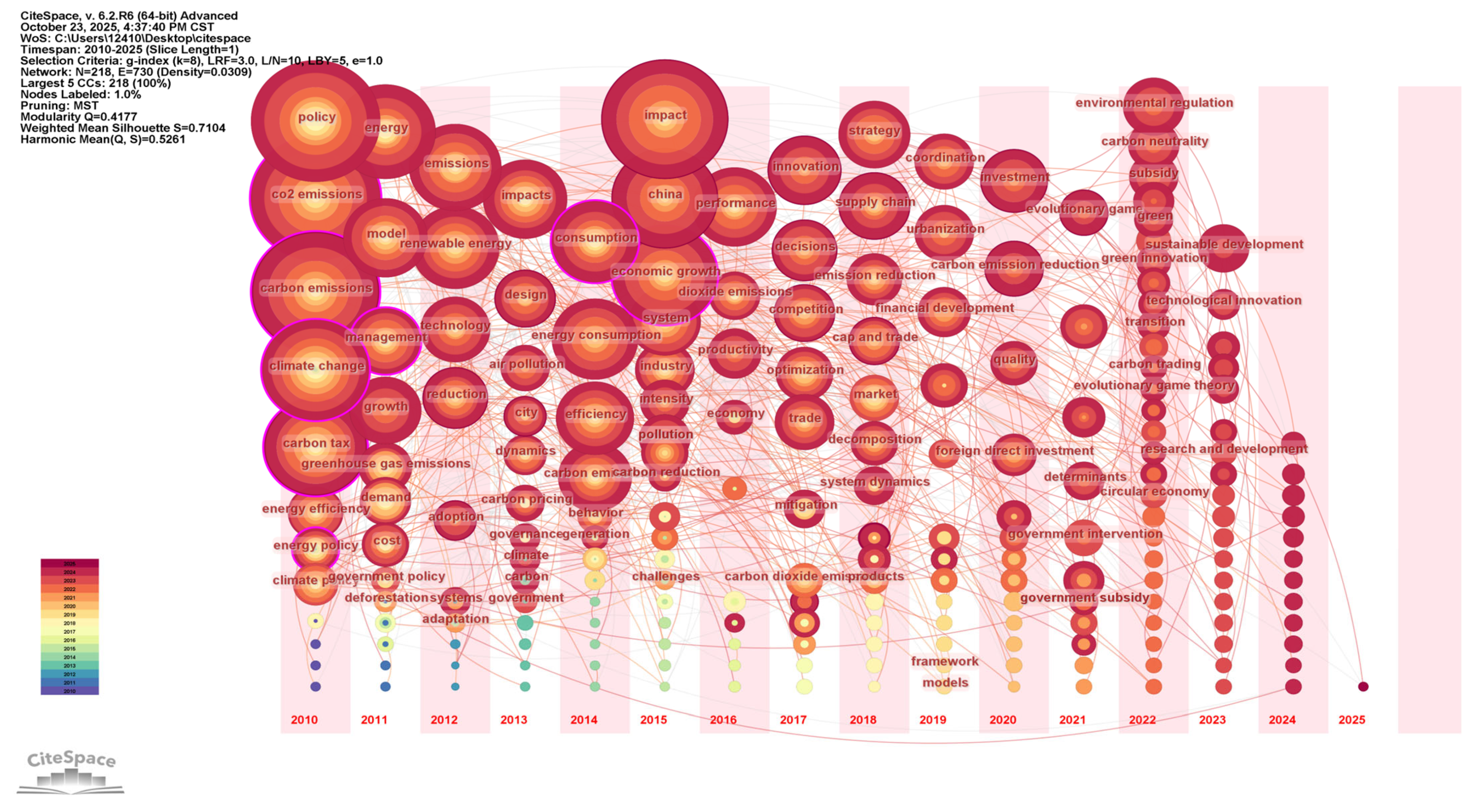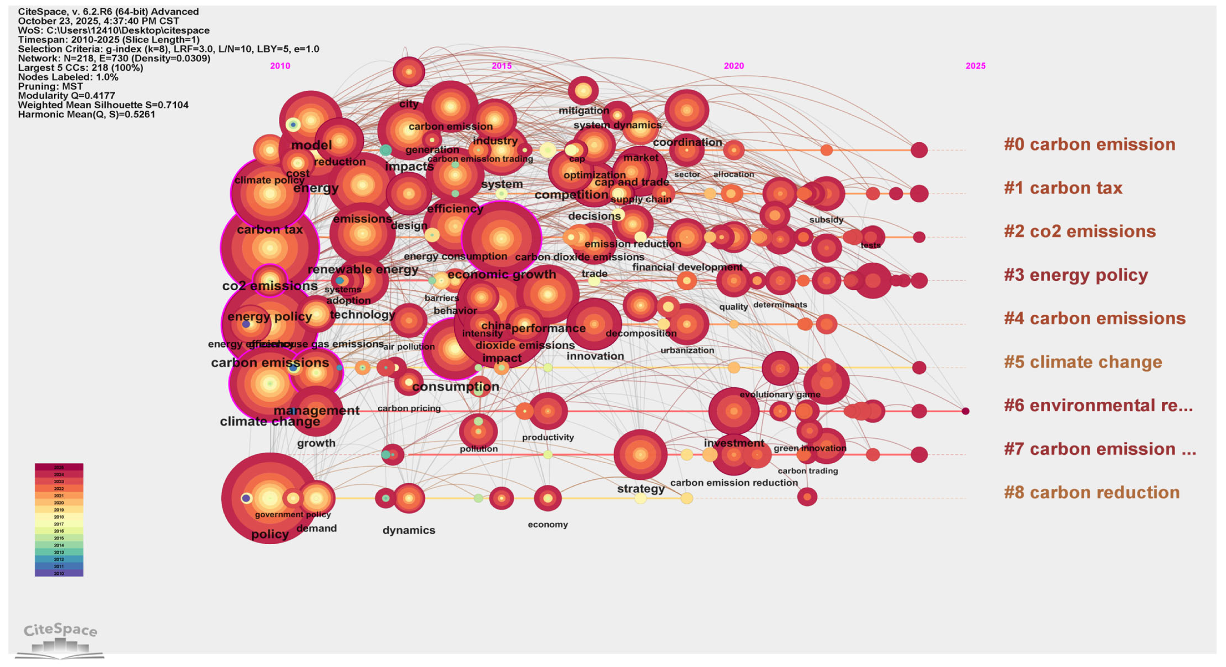 - Guo, Q.; Yao, P. Bibliometric review of carbon peak with CiteSpace: Evolution, trends, and framework. Environ. Sci. Pollut. Res. 2024, 31, 13592–13608. [Google Scholar] [CrossRef]
