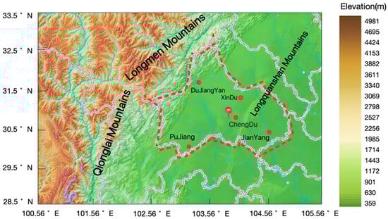 As a typical inland basin city, Chengdu is characterized by calm-wind and high-humidity climatic conditions that exacerbate the UHI effect far more than in most comparable regions. Geographically, Chengdu is located in the western Sichuan Plain (Chengdu Plain), enclosed by complex mountainous terrain—bounded by the Longmen Mountains to the northwest, the Longquan Mountains to the east, and the Qionglai Mountains to the west (Figure 1). This semi-enclosed topography restricts horizontal air circulation and promotes heat and moisture accumulation, especially during summer (Yang et al., 2025) [10]. The relatively low elevation of the basin floor contrasts sharply with the surrounding mountain ranges exceeding 4000 m, creating strong thermal inversions that suppress convective exchange. These features jointly contribute to Chengdu’s persistently stagnant boundary layer, limited ventilation capacity, and elevated nighttime temperatures, which further intensify extreme heat events and amplify cooling energy demand (Liu et al., 2018) [11].