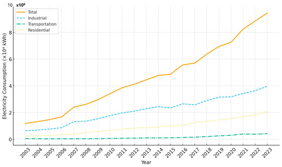 In this study, is set to 120 M kWh day−1, representing Chengdu’s average daily baseline electricity consumption under neutral temperature conditions (i.e., CDD = 0), derived from the averaged total consumption from 2013 to 2023 (Figure 2) converted to a daily scale. The coefficient is calibrated as 10 M kWh day−1 °C−1, indicating that each additional cooling degree day increases the city’s total daily electricity demand by approximately 8–10% relative to the baseline. These values are consistent with reported seasonal load variations in major inland cities of China (Ding et al., 2007) [34] and serve as a conservative yet realistic representation of Chengdu’s cooling-sensitive electricity demand.