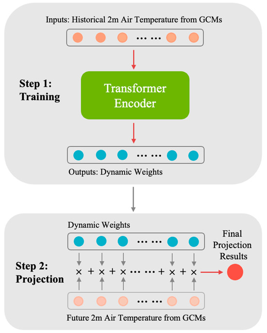 In this study, we implemented a Transformer-based downscaling framework using the standard PyTorch library (https://docs.pytorch.org/docs/stable/generated/torch.nn.TransformerEncoderLayer.html, accessed on 6 July 2025). As illustrated in Figure 3, at each time step the input vector, consisting of outputs from CMIP6 models, is processed by a Transformer encoder that generates a set of time-varying weights through multi-head self-attention. These weights are then used to compute a weighted sum of the inputs, yielding the final ensemble projection.