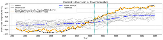 Figure 4 illustrates the comparison between simulated and observed 10-year moving average air temperatures for the historical period (1983–2014). The individual GCMs exhibit large variability, and their simple average deviates substantially from the observations (black line), generally overestimating temperature before 2000 and underestimating temperature afterwards and failing to capture the amplitude of both warming and cooling phases. In contrast, the Transformer-based downscaling closely matches the observations. More importantly, it not only reproduces the long-term trend in the training phase but also performs consistently well during the testing period (2001–2004), achieving notably lower root mean square errors (RMSE). The Transformer framework attains a testing RMSE of 0.07 °C. These results demonstrate that the Transformer framework substantially enhances the fidelity of historical climate reproduction compared to conventional ensemble-averaging methods.