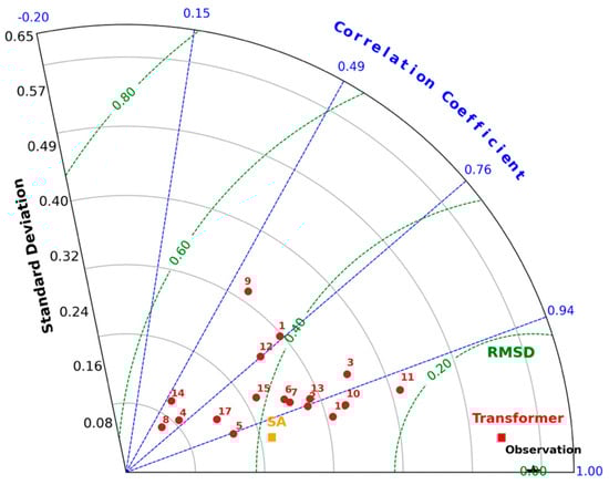 Taylor diagram showing the performance of individual GCMs, their simple average (SA), and Transformer-based downscaling for the historical period (1983–2015).