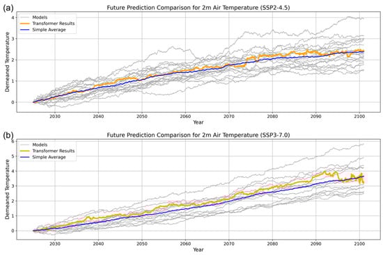 The Taylor diagram (Taylor, 2001) [36] reinforces the superior performance of Transformer-based downscaling. Figure 5 shows that individual CMIP6 models exhibit substantial discrepancies in simulating 2 m air temperature over Chengdu. Most of the models significantly underestimate the observed standard deviation (0.58 °C), and their root-mean-square differences (RMSD) are typically greater than 0.2 °C, reflecting systematic biases in reproducing observed long-term temperature variability. In addition, conventional ensemble methods such as simple averaging (SA) reduce inter-model spread but still display notable deviations from observations. By contrast, the proposed Transformer-based downscaling method outperforms both individual GCMs and SA across all key metrics, including standard deviation, RMSD, and correlation coefficient. In particular, its correlation with observations reaches 0.98 and its RMSD is less than 0.05 °C, indicating much higher fidelity in capturing historical temperature evolution. These results underscore the advantages of the Transformer framework, which dynamically adjusts model weights through self-attention, effectively overcoming the limitations of static averaging and providing a more reliable approach for regional climate projections. Overall, the Transformer approach not only aligns more closely with observations in terms of statistical consistency but also outperforms all benchmark methods in overall accuracy, offering a robust foundation for regional warming projections.