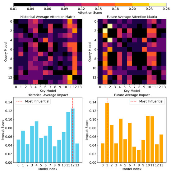 Figure 8 visualizes the Transformer’s internal attention structure, highlighting how the model dynamically assigns importance to different GCM inputs during both the historical and future periods. The attention matrices (top panels) reveal that the learned relationships among models are not uniform: certain GCMs consistently receive higher attention scores, indicating stronger influence in determining the ensemble prediction. In the historical period, attention seems more evenly distributed, reflecting comparable reliability among models. In contrast, under future conditions the attention map becomes more polarized, with several models receiving distinctly higher scores, suggesting that the Transformer adaptively emphasizes models that better capture the evolving temperature signal under stronger forcing scenarios. The impact bars (bottom panels) further quantify this shift, showing that the most influential models change from Index 12 in the historical stage to Index 0 in the future stage. This dynamic re-weighting demonstrates the framework’s capacity to learn temporal dependencies and adjust inter-model trust as climate variability and extremes intensify, which is an ability that static multi-model averaging cannot reproduce.