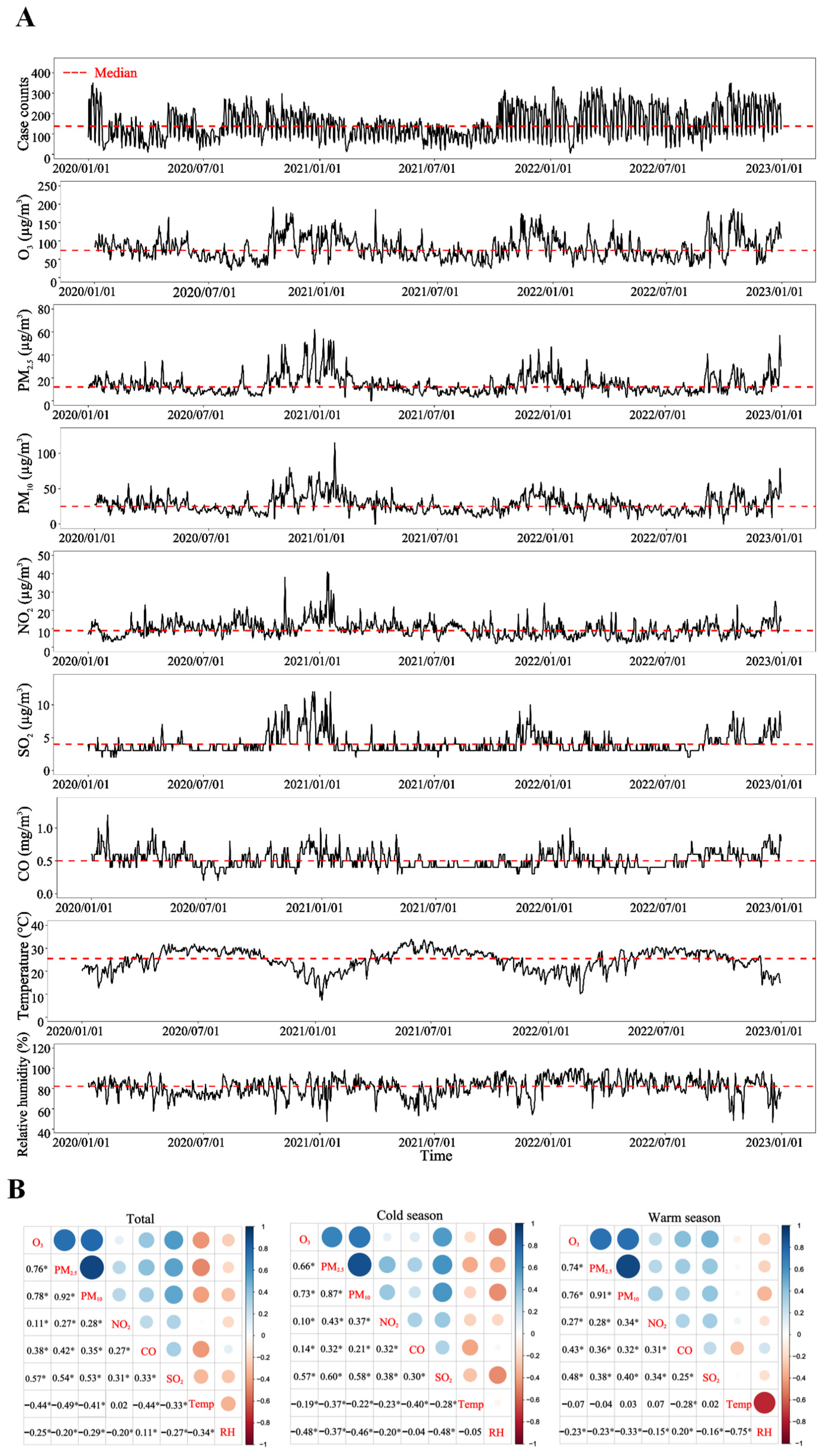 - Chen, Y.; Zheng, M.; Lv, J.; Shi, T.; Liu, P.; Wu, Y.; Feng, W.; He, W.; Guo, P. Interactions between ambient air pollutants and temperature on emergency department visits: Analysis of varying-coefficient model in Guangzhou, China. Sci. Total Environ. 2019, 668, 825–834. [Google Scholar] [CrossRef]