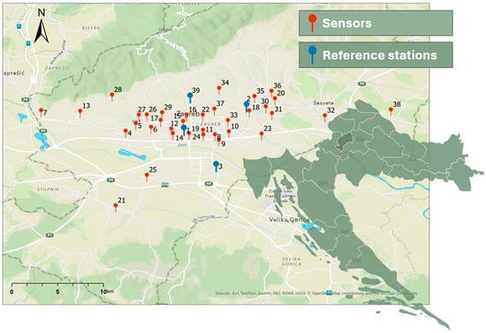 Sensor placement was coordinated by public health experts in collaboration with local stakeholders and guided by prior pollution maps, population demographics, health indicators, and urban infrastructure characteristics. When selecting micro-locations, the requirements of the Ordinance on Air Quality Monitoring (Official Gazette 72/20) were taken into consideration. Micro-locations for monitoring traffic-related air pollution were selected in collaboration with the Faculty of Transport and Traffic Sciences at the University of Zagreb.