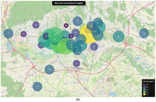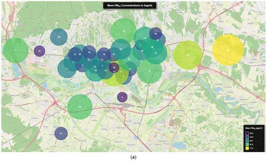 Spatial distribution of mean PM10 (a) and NO2 (b) concentrations (in µg/m3) in Zagreb (March 2022–May 2024).