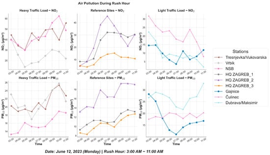 To analyze pollutant dynamics during rush hours, measuring sites were categorized into three groups: heavy traffic load sites, light traffic load sites, and referent stations. Three sites were picked per category to showcase it. Sites were classified according to the density of surrounding roads and transport lines, along with the overall intensity of traffic activity. Areas experiencing heavy traffic were designated as congestion-prone urban zones, whereas light-traffic sites were found in calmer residential neighborhoods. The heavy traffic load sites included Vrbik, NSB, and Trešnjevka/Vukovarska, while the light traffic load sites were Gajnice, Dubrava/Maksimir, and Čulinec. Additionally, three referent sites, HQ Zagreb 1, 2, and 3, were used.