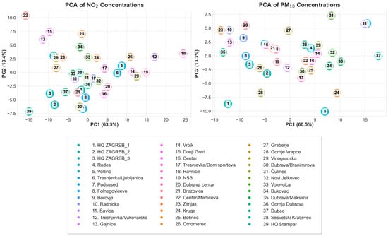 Principle component analysis (PCA) was applied to standardized weekly average concentrations of NO2 and PM10 across all monitoring stations to understand similarities and differences in pollution behaviour among locations. The left subplot in Figure 4 shows the PCA projection of NO2 data, while the right subplot presents the corresponding results for PM10. Each point represents a station, labelled by its station number and color-coded for clarity. For NO2 results, the stations are more widely dispersed in the PCA plot, indicating higher variability in NO2 pollution profiles across different locations in the city. This spatial spread reflects how local factors such as traffic density and urban structures affect pollution levels at specific stations. In contrast, the PCA of PM10 concentrations revealed a tighter clustering of stations, indicating more uniformity across locations, although some sites (e.g., 1, 5, 11, 31, and 37) still exhibited distinct behavior. Reference-grade DHMZ monitors (stations 1, 2, and 3) appear among the outliers due to their higher precision and calibration standards, while station 39 (ASTIPH reference-grade) was excluded from the PM10 analysis due to insufficient data. The first two principal components (PCs) capture most of the variance for both pollutants, enabling clear visual separation between stations with similar versus distinct pollution profiles.