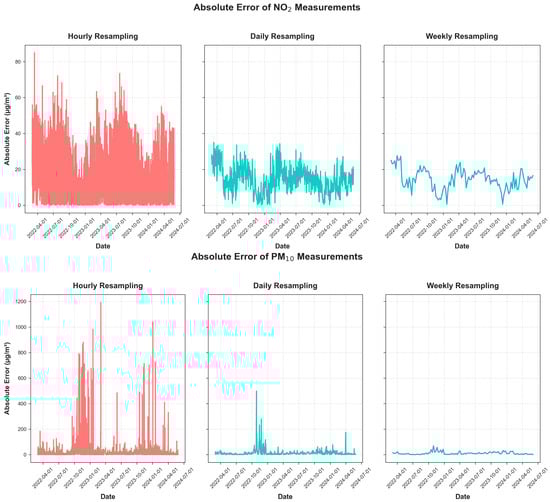 In this section, measurements from the sensors are compared to reference measurements. Figure 5 presents the absolute error of NO2 and PM10 measurements across three temporal resolutions: hourly, daily, and weekly. To compute the absolute error, measurements from all sensor sites were aggregated by calculating the median, and the same procedure was applied to the reference measurements. The absolute error was then derived from the difference between these aggregated values. These three temporal resolutions were chosen to capture different characteristics: hourly sampling reveals high-frequency fluctuations, daily sampling smooths short-term variations, and weekly sampling highlights long-term error trends. This aggregated error analysis was designed to provide a network-level overview of deviations between the ensemble of sensors and reference stations, explaining temporal and seasonal error patterns rather than quantifying the bias of individual sensors. The upper plot (Figure 5) shows the absolute error of NO2. Hourly resampling reveals high-frequency fluctuations with peaks exceeding 60 µg/m3, with larger error clusters appearing notably in mid-2022 and 2023. In the daily resampling, while peaks are smoother, the absolute error typically ranges from 10 to 30 µg/m3. Weekly resampling shows relatively stable error values, fluctuating between 10 and 20 µg/m3, with occasional increases. The lower plot in Figure 5 shows the absolute error of PM10, where hourly resampling exhibits extreme spikes, with errors reaching or exceeding 1200 µg/m3. The distribution is more sporadic than for NO2, with pronounced outliers, especially in late 2022 and early 2023. Daily resampling reveals clearer temporal patterns, with bursts of error visible around late 2022 and early 2024. Despite smoothing, occasional spikes up to 400 µg/m3 for PM10 persist. Weekly resampling drastically reduces variability, with general error levels below 40 µg/m3, indicating that most extreme fluctuations are short-lived. The analysis shows that as the temporal resolution changes from hourly to weekly, extreme error values are significantly smoothed. This suggests that while high errors do occur, they are typically brief in duration, and daily or weekly averaging provides a more accurate estimation of long-term sensor bias. Given that air quality data are reported as daily values, this suggests sufficient quality for reporting even before software calibration. Moreover, PM10 shows larger and more extreme errors compared to NO2, especially in the hourly and daily views. This suggests that PM10 predictions from sensors are more sensitive to episodic or extreme pollution events than those of NO2. Both pollutants exhibit seasonal or periodic errors. For instance, NO2 errors tend to decrease during late summer and rise again in winter, potentially due to changes in atmospheric dispersion or emission patterns (e.g., increased heating-related emissions in colder months). There is also a visible downward trend in error variability over time, particularly for PM10 during late 2023 and early 2024. This may indicate improvements in the modeling approach or enhanced calibration of the sensor data.