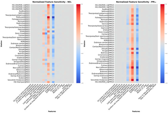 Max-normalized feature sensitivity for NO2 (left) and PM10 (right) across monitoring stations.