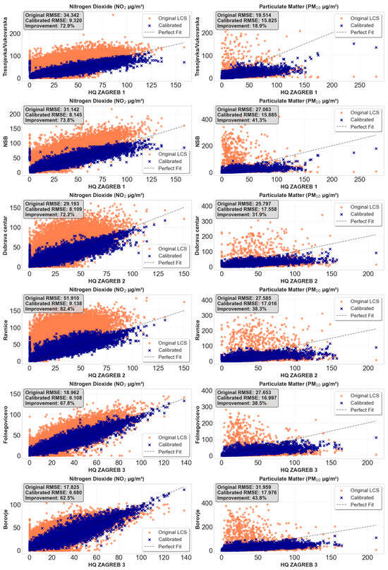 In Zagreb, a dense network of sensors has recently been deployed across the city. Quality control tests and equivalence tests between national and local measuring stations, as well as between the local HQ Stampar measuring station and the city sensor system, are carried out regularly by national and local stakeholders in accordance with legislative requirements. To use HQ Stampar as a reference (“orientir”) station for the city sensor system, continuous monitoring is ensured through monthly quality validation of sensor system. Additionally, in line with legal and accreditation framework requirements, during the period from March 2024 to February 2025, an equivalence test was conducted comparing PM10 and PM2.5 values between the HQ Stampar station and the local city reference station using correlation with gravimetric results. The equivalence test confirmed that, with the application of correction factors, PM10 and PM2.5 values from HQ Stampar ensure data quality within the required measurement uncertainty of <25%. A positive equivalence test of the HQ Stampar station as the reference station for the sensor system, together with monthly comparability checks of the sensor system, contributes to continuous and efficient monitoring and calibration of sensor system data. Still, until now, no comprehensive evaluation of their performance, calibration needs, local event monitoring, or long-term stability has been published. A recent study [31] compared low-cost AQMesh sensors with reference stations in Zagreb but did not apply ML calibration or assess recalibration intervals, underscoring the need for our extended city-wide approach based on ML and rolling RMSE.