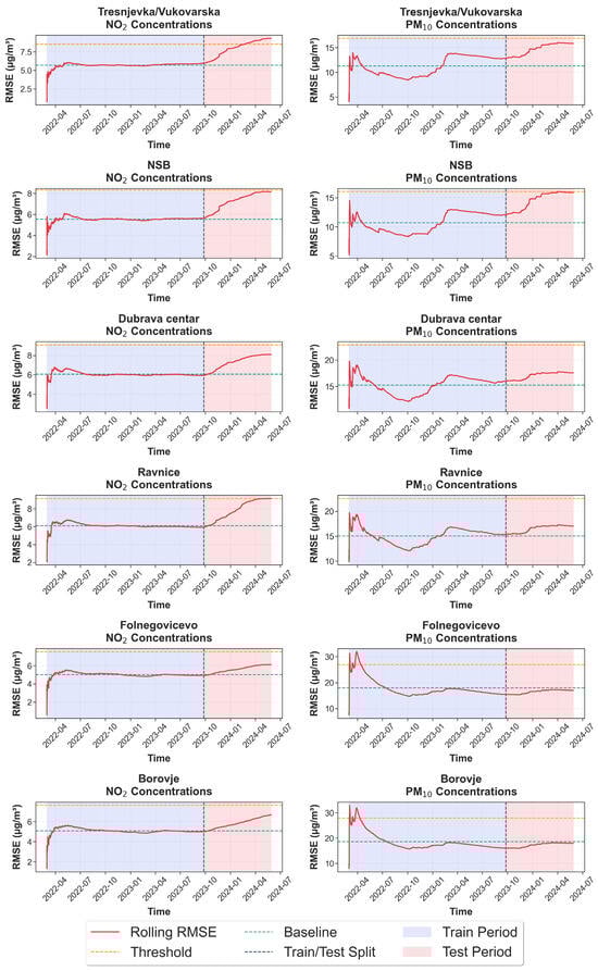 Figure 7 shows the results of the calibration model applied to hourly data. The pre-calibration data are represented as orange dots, while the calibrated values obtained after applying the model are shown in blue. The left column presents results for NO2, and the right column shows PM10. Each subplot includes the RMSE for the original and calibrated data, along with the calculated percentage improvement. Across all the sensor sites, at higher pollutant concentrations, the original (pre-calibration) data diverges substantially from the reference measurements. The apparent divergence between the sensor and reference data measurements before calibration primarily reflects differences in hyperlocal context. The indicative air quality stations were installed on lighting poles in close proximity to emission sources, up to 4 m above ground and directly facing the street. In contrast, reference-grade stations are generally positioned more than 10 m away from major roads and in semi-open environments to ensure regulatory representativeness. As a result, the indicative sensors often record higher short-term peaks and stronger spatial gradients. These hyperlocal variations naturally lead to discrepancies when comparing sensor data with reference stations, especially without spatial normalization. After calibration, the data points align much more closely with the reference values, indicating a significant improvement in accuracy. The calibration process led to a substantial reduction in RMSE across all sites and for both pollutants. The improvements ranged from 18% to 82%, revealing the effectiveness of the applied correction methodology. The most significant improvement occurred at Ravnice for NO2, where the RMSE dropped from 51.91 to 9.14 µg/m32, representing an 82% improvement. For PM10, although the initial error levels were generally higher than for NO2, the calibration still resulted in consistent performance gains, with improvements exceeding 40% in most cases. To better understand the performance of the calibration model over time, rolling RMSE was calculated for both NO2 and PM10 at each location. This site-specific analysis complements the aggregated error assessment by providing a temporally resolved evaluation of calibration performance, capturing sensor drift and model degradation over time. Figure 8 shows these results, with NO2 on the left, and PM10 on the right across all six sensor locations. Each subplot tracks the model’s performance over the entire time span of the dataset. The blue-shaded area represents the training period, while the red-shaded area corresponds to the test period. These two periods are separated by a black vertical dotted line indicating the train/test split. The green dotted line shows the baseline RMSE, calculated during the training phase. The red dashed line represents a threshold that indicates when model recalibration may be necessary. This threshold is defined as a 50% increase over the baseline RMSE. At all locations, model drift is evident during the test period, particularly in 2024, where RMSE increases for both NO2 and PM10. The increase in RMSE is earlier and more pronounced for PM10, in line with its greater variability and sensitivity. The earliest recalibration is observed at Folnegovićevo station for PM10, just 36 days into the test period, while the latest occurs at Trešnjevka/Vukovarska for NO2, after 148 days. In some locations, the threshold is not exceeded during the test period, indicating more stable model performance. Notably, Dubrava Centar, Ravnice, and Folnegovićevo stations show rapid error growth, suggesting that these sites may require more frequent retraining or adaptive calibration strategies. The defined thresholds offer a quantitative and interpretable method for identifying when a deployed model’s performance declines to an unacceptable level, supporting effective model maintenance and monitoring practices.
