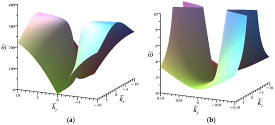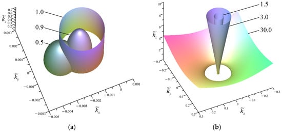 Frequency isosurfaces in wave number space according to the dispersion relation (42). (a) . (b) .