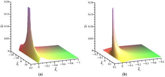 (a) Surface plot of (low frequency region) without buoyancy according to Equation (42). (b) The same as (a) for .