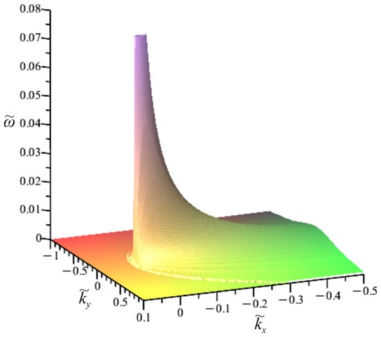 We also present a graph of the surface assuming a small vertical wavelength and no buoyancy (Figure 8). A comparison with Figure 6a suggests that the absence of buoyancy does not necessarily result in the manifestation of the β-effect. The β-effect only manifests itself when both a small vertical wavelength and the absence of buoyancy are assumed. Therefore, in order to study the influence of buoyancy on the manifestation of the β-effect, it is necessary to analyze the complete dispersion relation. Taking buoyancy into account and rejecting the assumption of a small vertical wavelength provides a more comprehensive view of the dispersion relation. Particularly, there are two non-overlapping wave spectra (Figure 4) propagating in the negative direction of the x-axis.