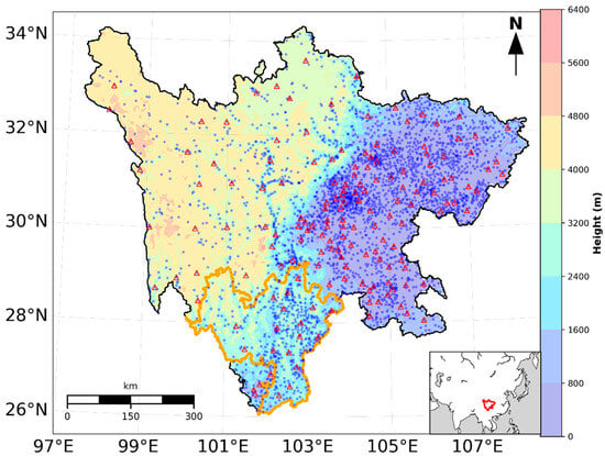 This study focuses on Sichuan Province (97°21′–108°33′ E, 26°03′–34°19′ N), located in southwestern inland China. The region features exceptionally complex terrain and topography, serving as an ideal natural laboratory for investigating wind field characteristics over heterogeneous surfaces. The terrain descends dramatically in a stepped configuration from west to east: the western region comprises the eastern edge of the Qinghai-Tibet Plateau with average elevations exceeding 4000 m, including the Hengduan Mountains and associated high-altitude valleys; the central zone consists of peri-basin mountains and hills at elevations of 1000–3000 m; the eastern area encompasses the low-lying Sichuan Basin with elevations below 750 m (Figure 1). This extreme elevation gradient (exceeding 7000 m) and diverse geomorphological units drive multiscale local circulation systems—ranging from plateau monsoons to basin calm winds, and from mountain-valley winds to downslope flows—resulting in pronounced spatial heterogeneity in near-surface wind energy resources.