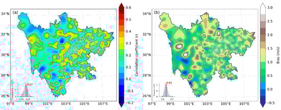 Spatial validation of WRF wind speed simulations against observations in the Sichuan Basin-Plateau region. (a) Spearman correlation coefficient between 6800 automatic weather stations observations (2016–2018) and WRF 5 km resolution climatological simulations (1979–2018). The red contour delineates r = 0.2. Inset histogram shows the frequency distribution with median r = 0.17 (red vertical line). (b) Spatial distribution of mean hourly wind speed bias (unit: m/s). The red contour indicates ME = 1.0 m/s. Inset histogram displays bias distribution with median MB = +0.91 m/s (red vertical line). Color scales represent correlation strength ((a): −0.1 to 0.6) and bias magnitude ((b): −0.5 to 3.0 m/s).