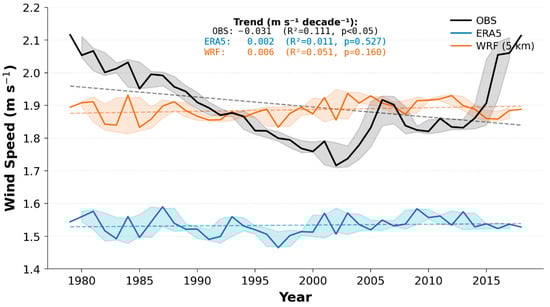In stark contrast, neither the ERA5 reanalysis nor the high-resolution WRF simulation reproduced this critical decadal variability. ERA5 consistently underestimated wind speeds by 0.3–0.5 m s−1 and exhibited a near-zero long-term trend (0.002 m s−1 decade−1). Since the WRF simulation is strictly forced by these lateral boundary conditions, it inevitably inherited this lack of trend variability. The WRF simulation, driven by these boundary conditions, consequently inherited this deficiency. This highlights a fundamental limitation of current regional climate modeling in capturing observed long-term wind speed evolution over this complex terrain, underscoring the need for caution when interpreting model-based trend analyses.