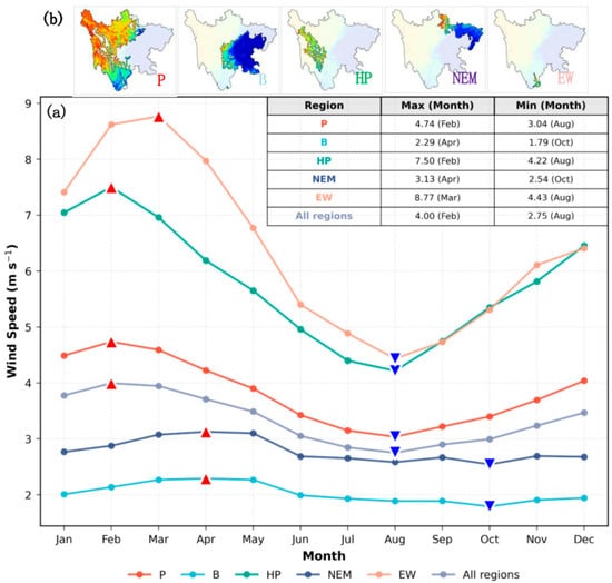 Seasonal patterns and spatial distribution of wind speed across different geographical regions. (a) Monthly mean wind speed for each sub-region (P, B, HP, NEM, EW) and the overall regional average. Upward-pointing (red) and downward-pointing (blue) triangles denote the months with maximum and minimum wind speeds, respectively. The inset table summarizes the timing of peak and minimum wind speeds for each region. (b) Spatial distribution of the geographical regions analyzed, with each color corresponding to a specific sub-region (as defined in the legend of Figure 3).