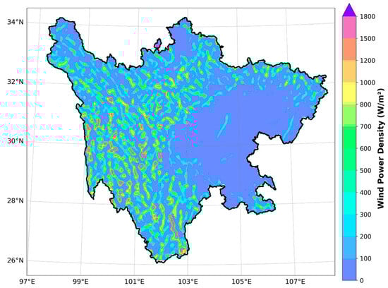 Figure 6 reveals a topographically dominated, pronounced east–west differentiation pattern in the annual mean wind power density (WPD) across Sichuan Province. Demarcated by the 103° E meridian, the eastern Sichuan Basin exhibits impoverished and uniformly distributed wind resources, with WPD generally below 100 W/m2. In stark contrast, the western region manifests as a heterogeneous mosaic of wind energy potential. A narrow transition zone distributes along the eastern margin of the Tibetan Plateau (102–103° E), where WPD increases abruptly, forming a distinct gradient. Wind-rich zones in the western plateau and mountainous areas, particularly in the core region of the northwestern Sichuan Plateau (97–101° E) and southern Liangshan Prefecture, do not conform to traditional contiguous plains in their high-value areas (>600 W/m2). Their spatial morphology presents a distinctive “venous” or “reticulated” structure, with high-WPD bands (800–1200 W/m2) clearly extending along mountain ranges and ridge orientations, punctuated by extreme-value cores. This fragmented, terrain-aligned distribution characteristic fundamentally indicates that premium wind resources in Sichuan Province are not directly controlled by large-scale weather systems, but rather result from the dominant role of topographic dynamic enhancement mechanisms. These include the “nozzle effect” of mesoscale topographic channels, airflow acceleration in passes and valleys, and dynamical effects generated by interactions between westerly circulation and the complex three-dimensional terrain of the Tibetan Plateau and Hengduan Mountains. This pattern underscores the necessity of high-resolution wind resource assessment in regions with complex underlying surfaces to identify such terrain-driven high-potential zones.