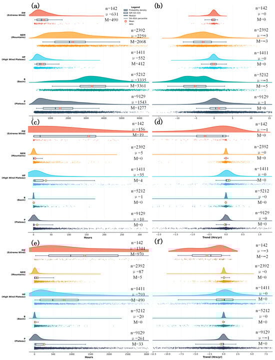 Spatiotemporal characteristics of non-operational wind speed events at 100 m height across five topographic zones in Sichuan Province (1979–2018). The rows represent three distinct constraints: (a,b) calm wind conditions (below 2 m/s); (c,d) standard cut-out wind speed (above 25 m/s); and (e,f) distributed wind turbine cut-out speed (above 15 m/s). The left column (a,c,e) displays raincloud plots of the climatological mean annual hours, illustrating the data distribution, box plots (white box: IQR; black line: median; red circle: mean), and raw data jitter. The right column (b,d,f) displays the distribution of linear trend slopes (hours/year) for the corresponding metrics. Statistical annotations include sample size (n), mean (μ), and median (M). Data are derived from WRF simulations. Abbreviations: B (Basin), NEM (Northeast Mountains), P (Plateau), HP (High Wind Plateau), EW (Extreme Wind).