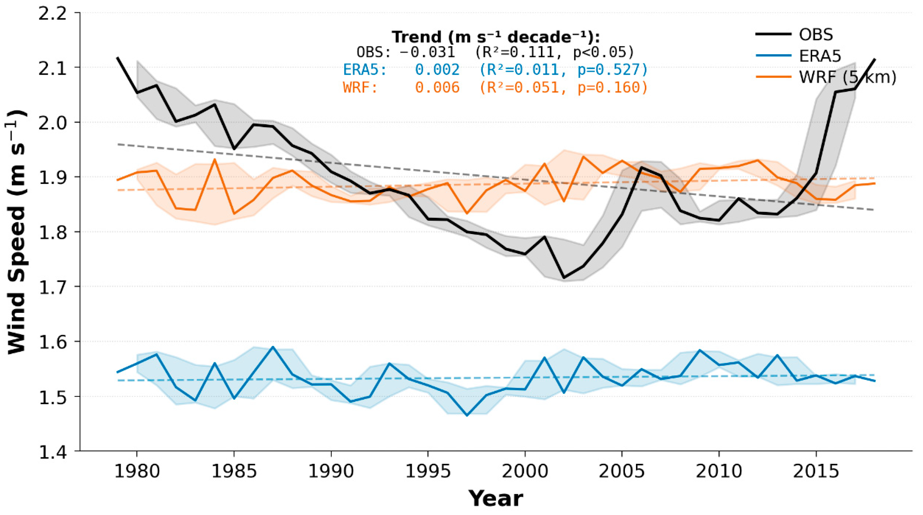 - Vautard, R.; Cattiaux, J.; Yiou, P.; Thépaut, J.; Ciais, P. Northern Hemisphere atmospheric stilling partly attributed to an increase in surface roughness. Nat. Geosci. 2010, 3, 756–761. [Google Scholar] [CrossRef]