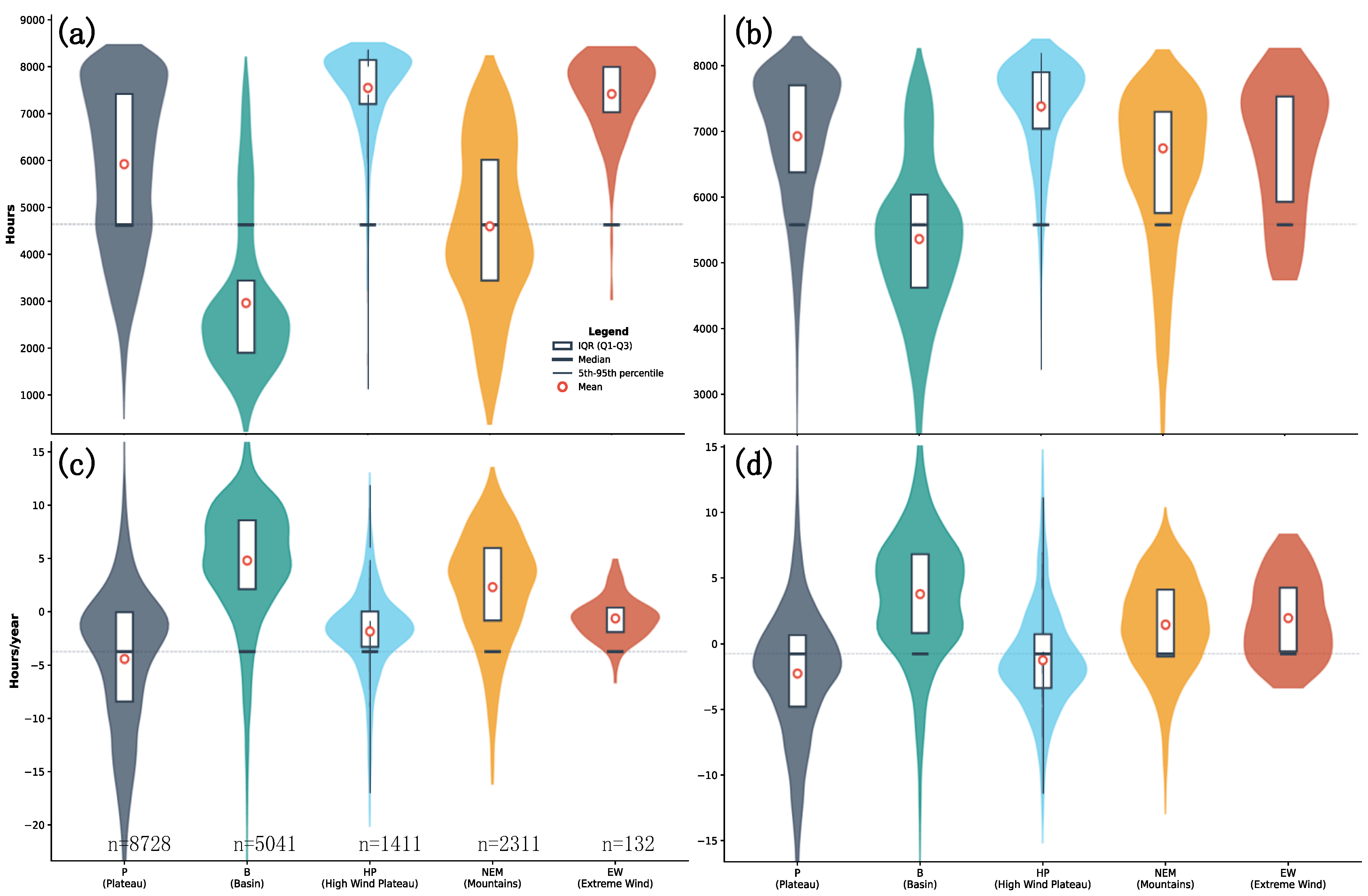 - Spatial distribution pattern analysis: Compute 40-year mean values for each grid cell, classify by five geographic zones, and visualize using violin plots to reveal median, mean, dispersion, and spatial homogeneity of resources across zones.