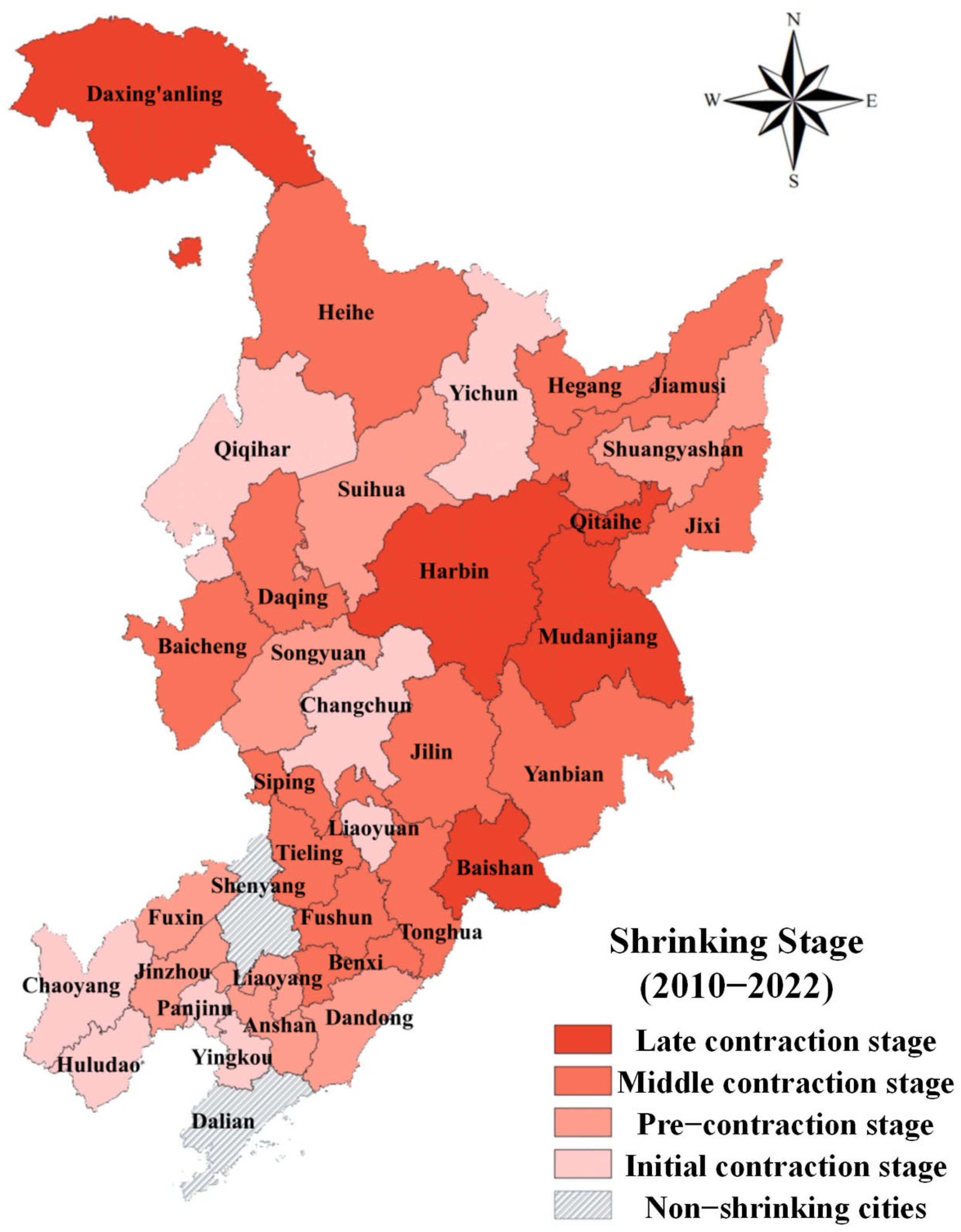 - Zhang, S.; Long, S.; Cai, E.; Ma, J.; Li, L. Identification and evolutionary pattern analysis of shrinking cities in China from 2000 to 2020. Areal Res. Dev. 2025, 44, 62–69. [Google Scholar] [CrossRef]