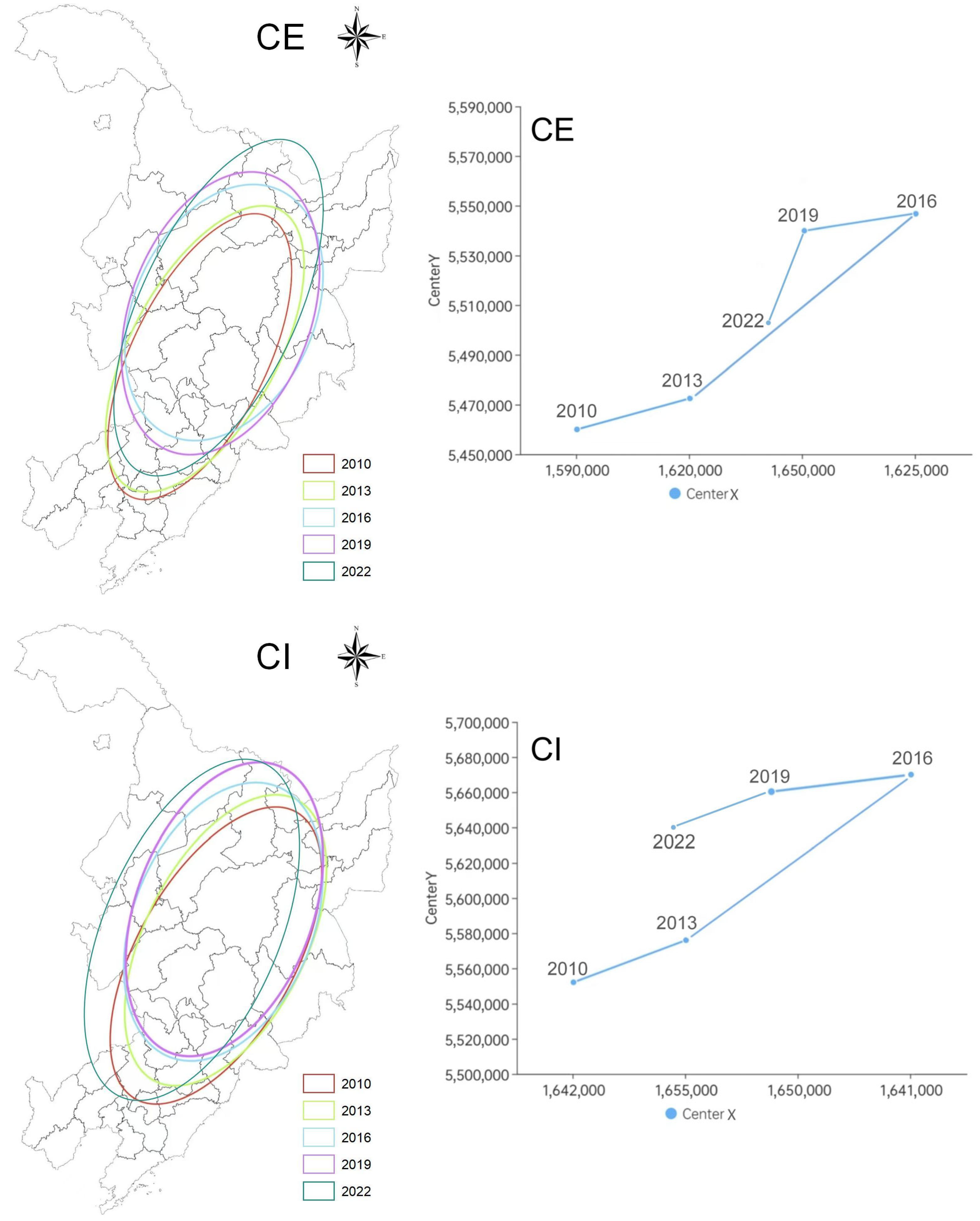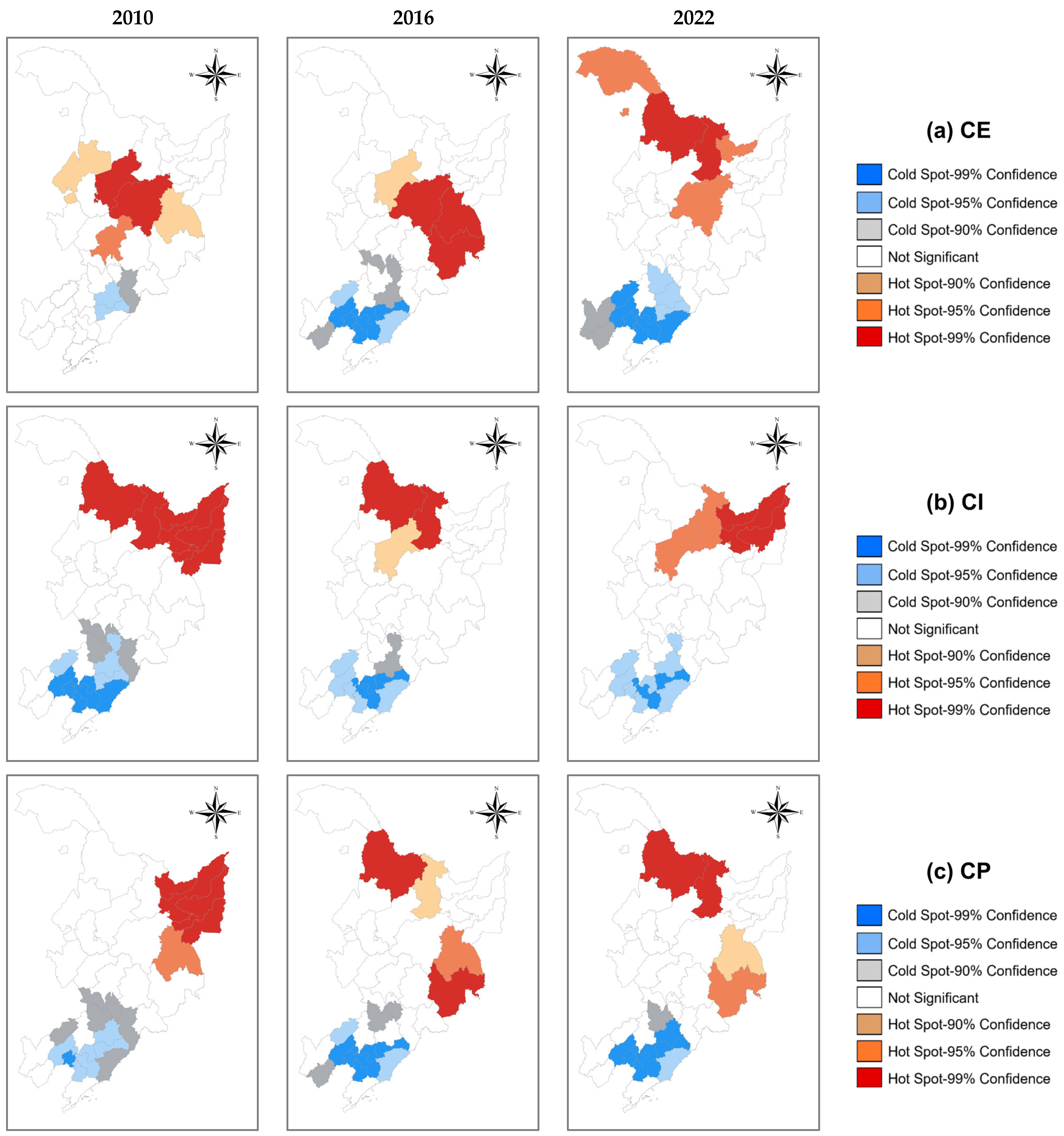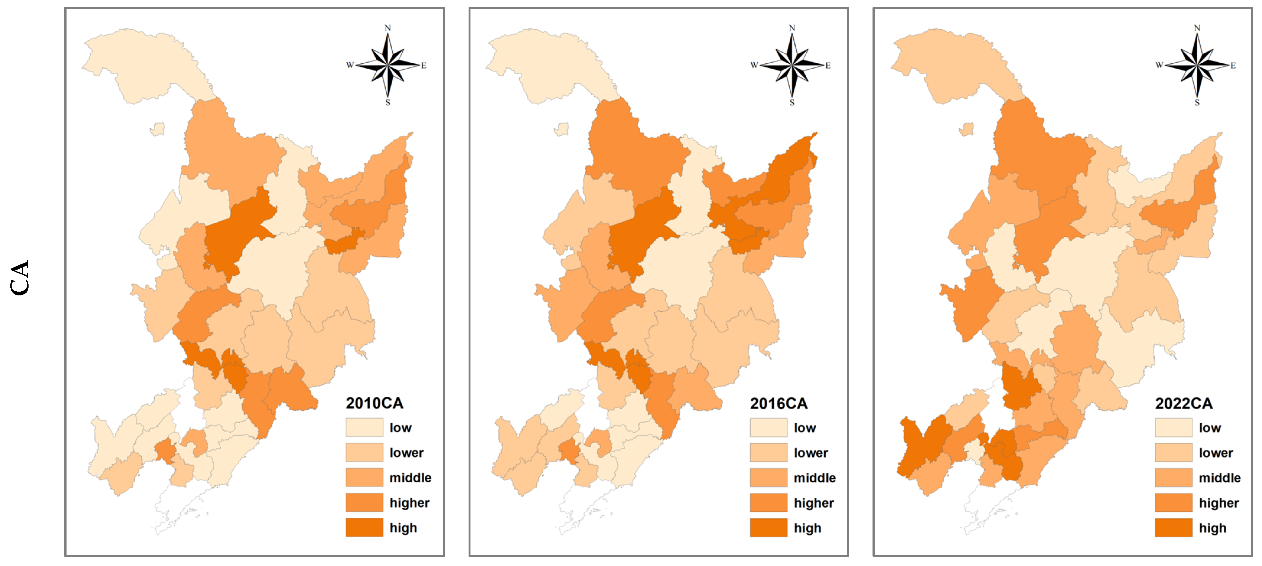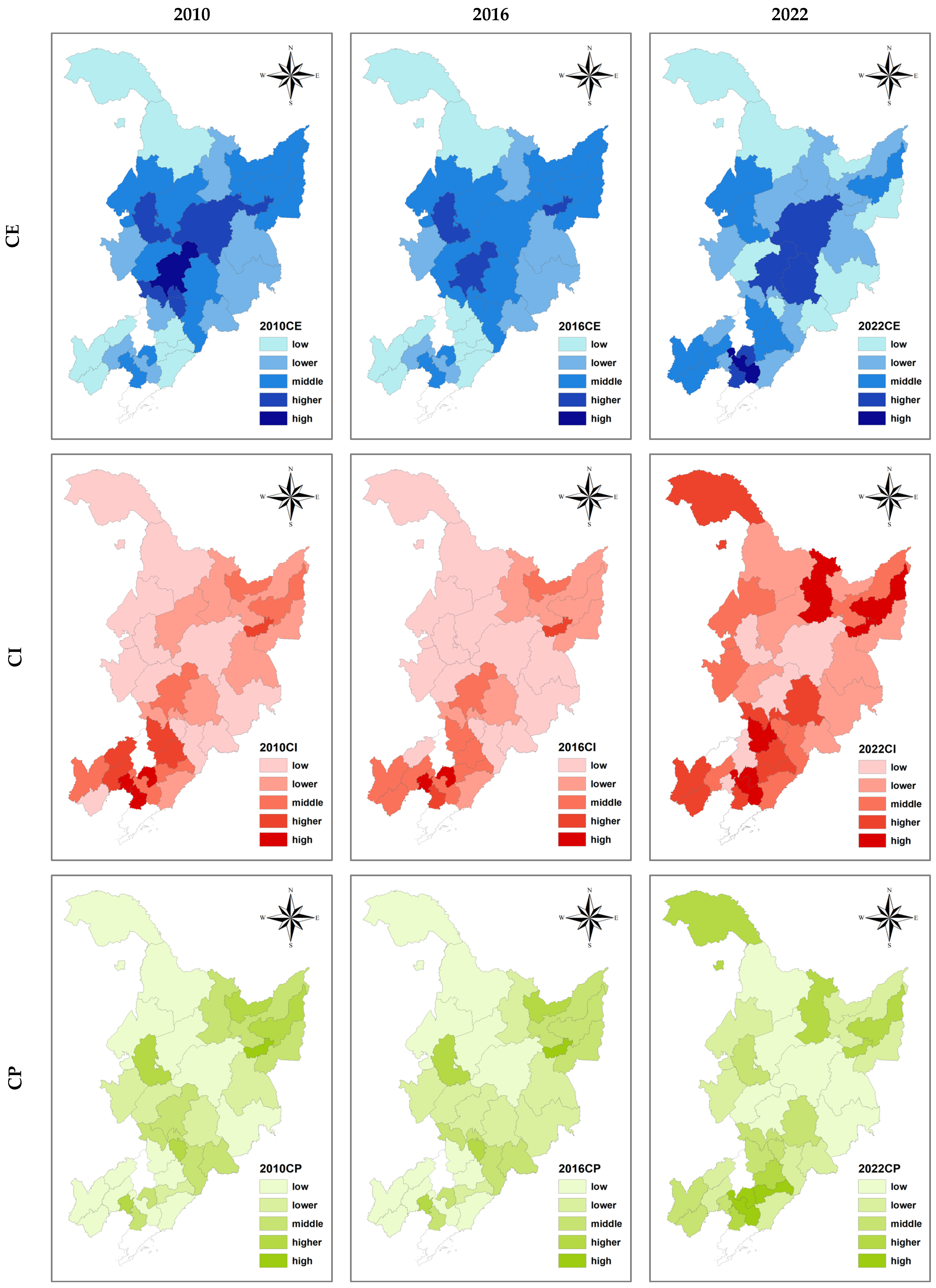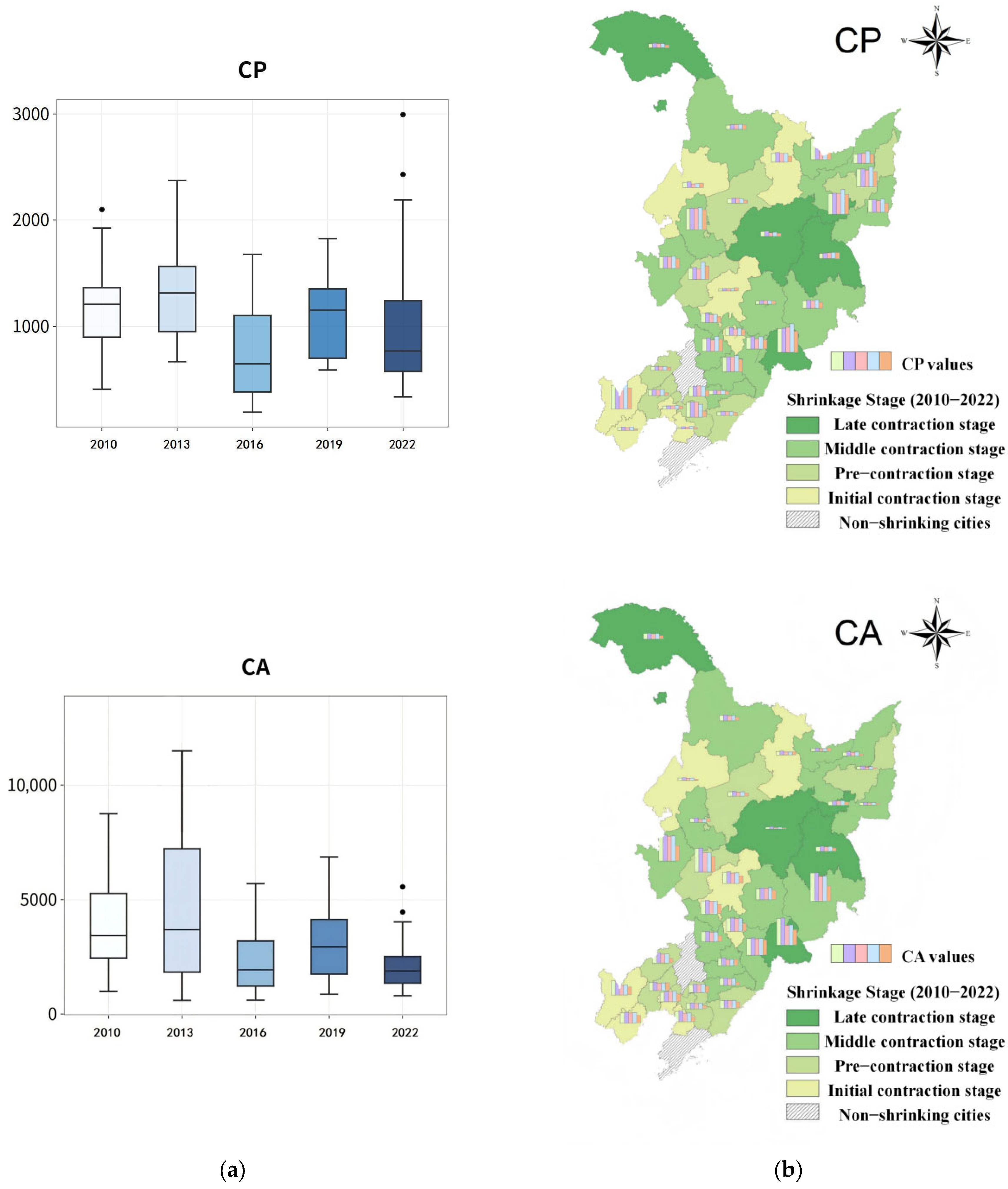 - On the temporal scale, we observed significant fluctuations in total CE and carbon intensities related to economy, population, and space (CI, CP, CA) during the study period. Specifically, CE and CP showed considerable volatility, while CI and CA demonstrated a gradual declining trend. Importantly, our analysis of the 2019–2022 period reveals that the pandemic shock exerted notable impacts on carbon emissions. These findings indicate that carbon emissions during urban shrinkage exhibit non-stationary characteristics over time, influenced by multiple factors, and reveal the complex interactive relationship between socio-economic development and carbon emissions in shrinking cities.