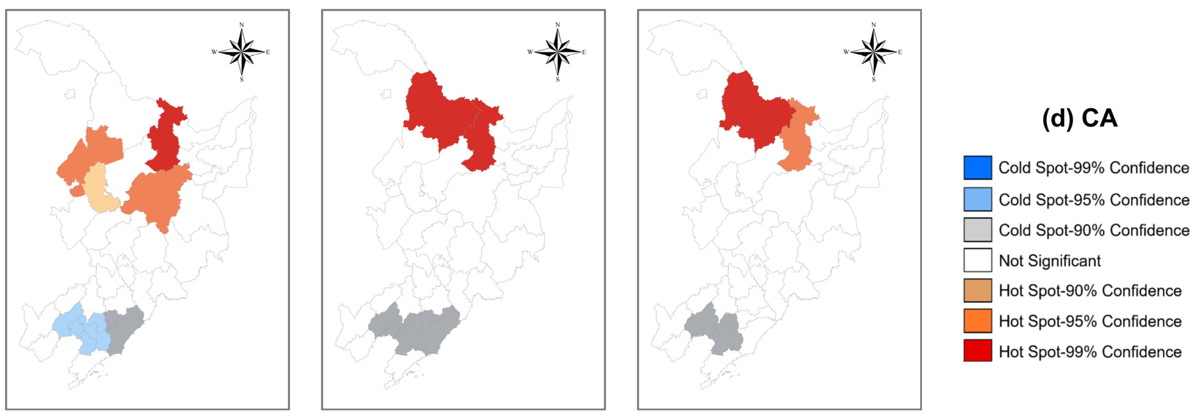 3.3.3. Coldspot and Hotspot Analysis—Spatial Heterogeneity in Data Distribution