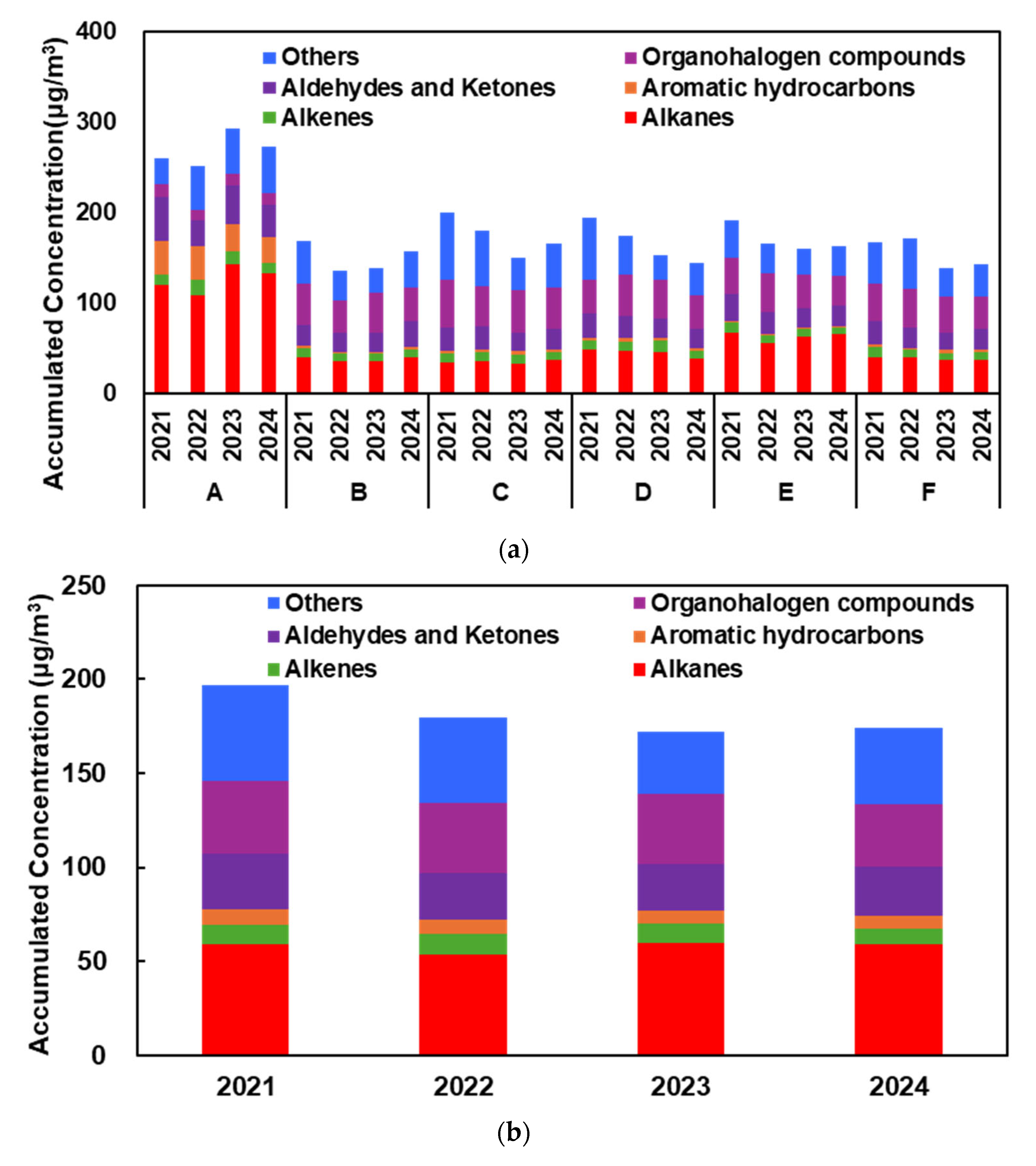 3.1. Analysis of TVOC (116 Compounds) Monitoring Data