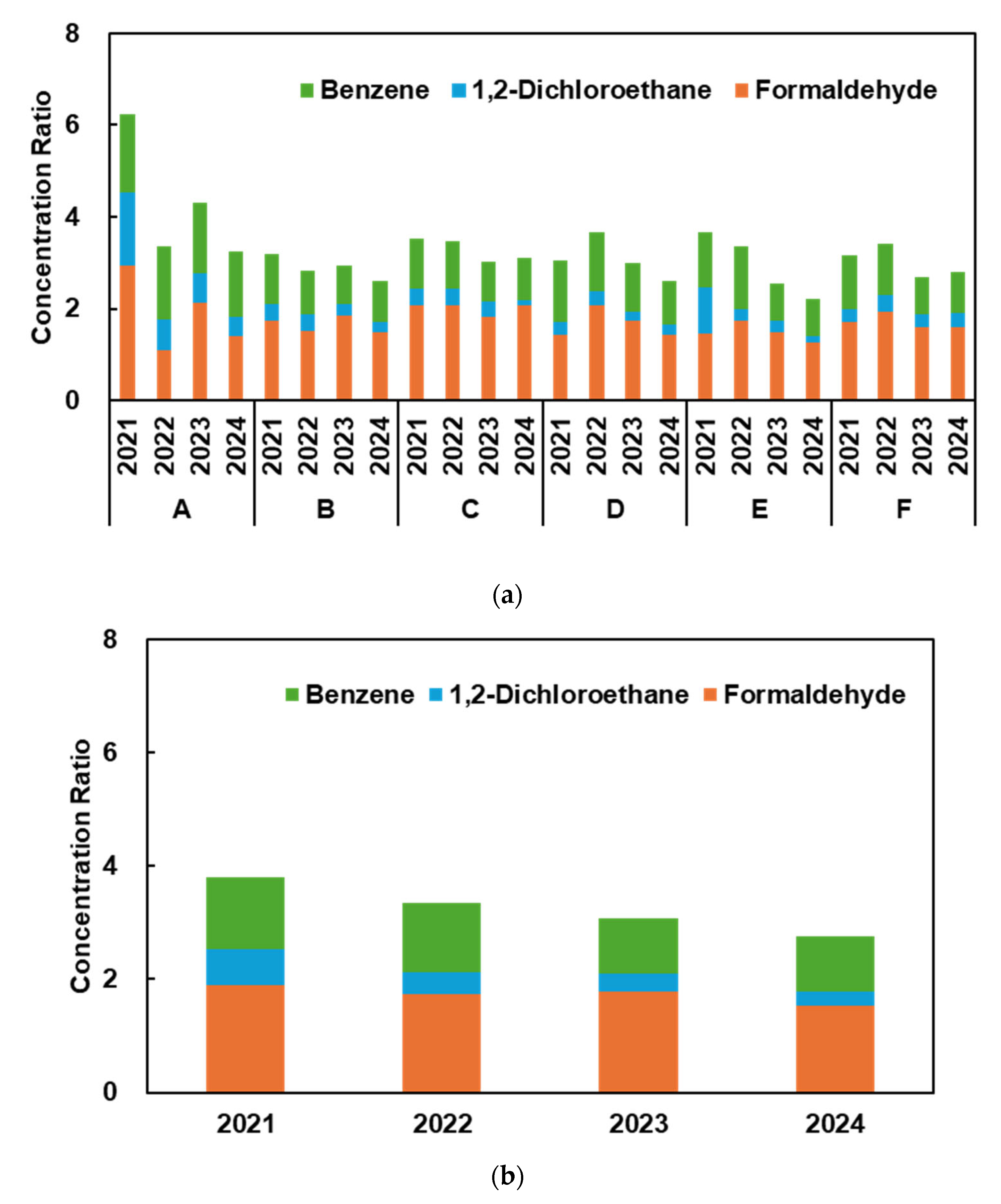 - Lee, J.; Lee, S.J.; Kim, S.J.; Kim, S.H.; Lee, G.; Chang, L.S.; Choi, S.D. Pollution characteristics and secondary formation potential of volatile organic compounds in the multi-industrial city of Ulsan, Korea. Atmos. Environ. 2024, 319, 120313. [Google Scholar] [CrossRef]