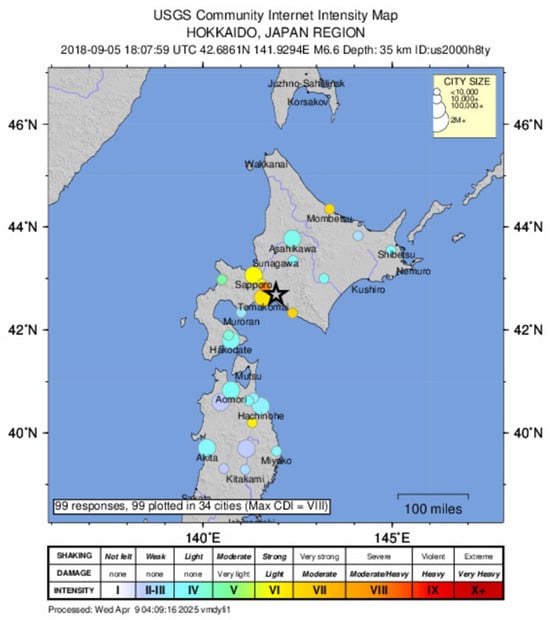 A large EQ happened in the Hokkaido Island at 3 h 7 m 59 s JST on 6 September 2018 (18:07:59 UT on 5 September 2018) with epicenter at 42.69° N, 142.01° E, as shown in Figure 1. The geomagnetic latitude and longitude of the epicenter were around 37° N and 135° E. Its magnitude (M) was 6.7, and its depth was 37 km. Focal mechanism analyses suggest that the rupture occurred either along a moderately dipping reverse fault striking northward or along a shallow to moderately dipping fault striking southeast. Considering both the depth and the focal mechanism, this earthquake most likely originated within the upper portion of the North American Plate rather than along the subduction interface between the Pacific and North American plates, which lie at approximately 100 km depth in this region. Despite its moderate magnitude, the seismic intensity reached a maximum level of 7, the highest ever recorded in Hokkaido.