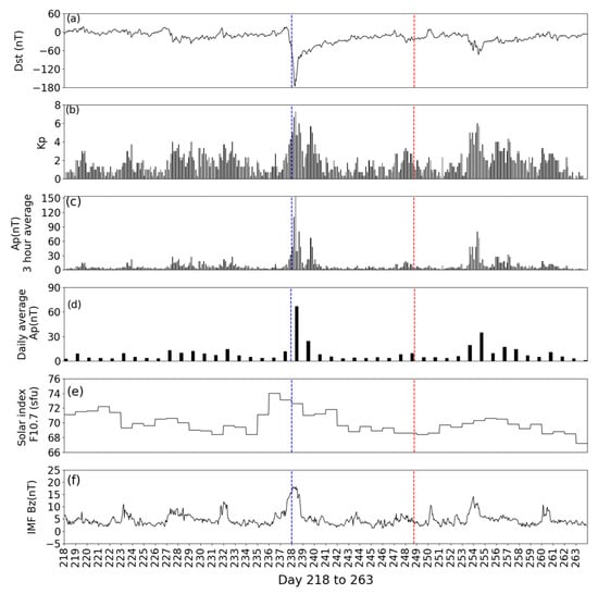 Figure 2. Solar–terrestrial conditions around the EQ date. The top four panels indicate the temporal evolutions of geomagnetic activity (a) Dst (in nT), (b) Kp index, (c) Ap index (3 h averages) (d) Ap index (daily averages), (e) solar flux radiation (f10.7) and finally (f) IMF (in nT), Bz (in nT). EQ day (DOY249) (5 September) is indicated by a vertical red line.