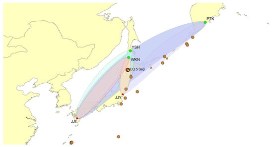 We give extensive importance to the effect of typhoons on VLF/LF propagation, because it is known that VLF/LF propagation anomalies can be identified within a few hours (mainly at night) only when a typhoon crosses the VLF/LF propagation path or within a few days when the typhoon passes close to the propagation path [94,95,96]. Unfortunately, we encountered a rather big typhoon, No. 21 # in Japan, during our seismic period. This typhoon was located in the south of Shikoku Island at UT = 00 h on 4 September, crossed the Osaka area, then passed into Japan Sea at UT = 12 h on 4 September, and moved to the north–west of Hokkaido Island at UT = 00UT on 5 September. The typhoon became closest to the most important propagation path of JJY-WKN at UT = 18 h on 4 September with distance of 250–300 km, far away from the JJY = −WKN propagation path, so we can expect and that the anomaly on 4 September as observed at WKN is highly likely to be unrelated to this typhoon, but to be of seismic origin. As an extension of this consideration, the VLF/LF propagation anomalies observed at Russian stations are, in principle, reflecting the same ionospheric perturbation as identified for the JJY-WKN propagation path.
