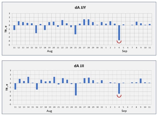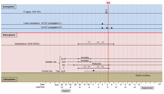 Based on the multi-parameter and multi-layer observational results, a consolidated summary is shown in Figure 17. In the ionospheric F-region (top layer), a possible anomaly was observed on 5 September; however, its significance is low, so it is marked with a white triangle, indicating low-confidence or uncertain detections. In contrast, perturbations in the lower ionosphere were identified with high confidence from both Japanese (denoted as J) and Russian (denoted as R) monitoring systems, and these strong detections are marked with black triangles in the figure. In the stratosphere, many AGW-like disturbances were observed, but these signals are most likely related to intense convective weather activity rather than seismic processes; therefore, they are marked with question marks to show ambiguity. At the Earth’s surface and within the lowest atmospheric layers, both satellite- and ground-based measurements were reviewed; however, due to the same severe weather conditions, no clear pre-seismic precursor signs could be identified. Still, the period from 29 August to 5 September, especially 30 August to 2 September, seems to be notably disturbed across multiple datasets, indicating a phase of increased geophysical variability.