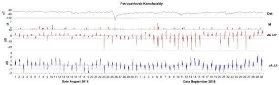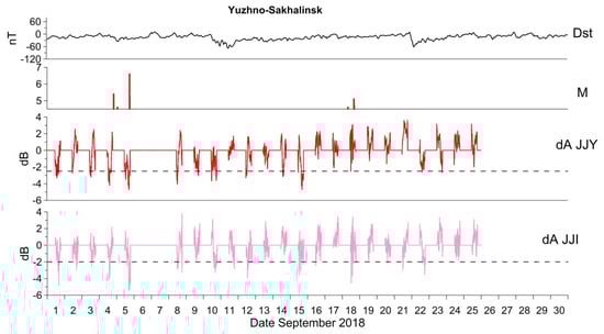 The VLF/LF outcomes from the Russian observation show that only the nighttime amplitude is presented in each hour in Figure 5 as observed at PTK, and Figure 6 shows the corresponding results at YSH. The bottom subpanels of Figure 5 illustrate the nighttime amplitude, dA(t): The upper and lower panels correspond to the JJY–PTK and JJI–PTK propagation paths, respectively. Horizontal dotted lines in both panels mark the −2σ threshold. For reference, the top subpanel in each figure shows geomagnetic activity (Dst index), while the bottom subpanel shows earthquake occurrences, as in Figure 3. Geomagnetic conditions were relatively quiet from early to late August, but became disturbed toward the end of August and into September due to several geomagnetic storms. Along the JJY–PTK path, a distinct anomaly exceeding −2σ was observed on 4–6 September, coinciding with and slightly preceding the earthquake. When combined with the Japanese results shown in Figure 4, these findings strongly suggest that the VLF/LF propagation anomalies on 4–6 September are likely precursory signatures of the earthquake. However, the anomalies on 5 and 6 September occurred during minor geomagnetic disturbances, making their seismogenic origin somewhat uncertain.