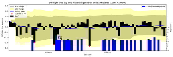 Figure 7. Deviation in observed nighttime average amplitude values from NARMAX-LSTEM predicted values with Bollinger band analysis of ±2σ. The day of the EQ with magnitude M = 6.7 is indicated by EQ (5 September). Finally, the value exceeding −2σ is indicated with a red circle on the top of each bar, and the anomaly on 4 September is a definite precursor to the EQ.