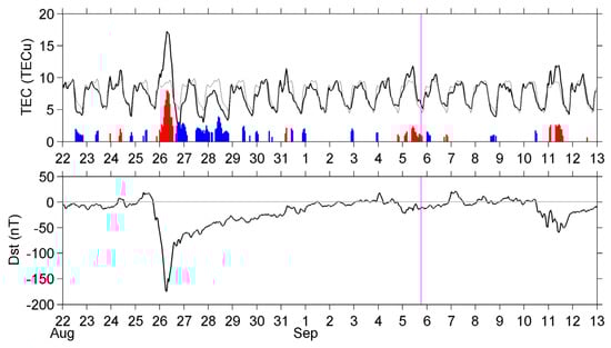 Figure 8. Temporal variation in TEC values over the EQ epicenter with full black lines. The thin black line indicates the mean over the previous month, with the differential dTEC (increase in red, decrease in blue) shown above the x-axis. A magenta line marks the EQ date. The bottom panel reproduces Dst variation.