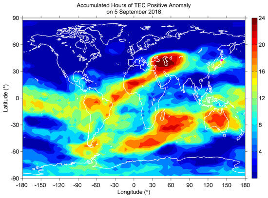 Figure 8 (top panel) shows TEC variation (black line), reflecting the upper F-region’s data, alongside the Dst index variation (bottom panel), since geomagnetic activity strongly influences the upper ionosphere. The mean variation over the previous month is shown with thin lines, and deviations from this mean (differential TEC or dTEC) are plotted above the x-axis: positive anomalies are in red, negative in blue; only those exceeding 1 σ are included. Notable geomagnetic storm effects on TEC are observed in late August and 11 September. The positive anomaly just before the earthquake on 5 September aligns with prior statistical findings of pre-earthquake TEC anomalies over Japan [97,98], with its polarity being positive. However, such positive anomalies also appear globally during weak geomagnetic disturbances, indicated by a Dst index around −20 nT. This is evident in Figure 9 which presents a global map showing the accumulated hours (h) during which TEC anomalies exceeded the +1σ (σ is the standard deviation) threshold on 5 September 2018. Around the earthquake epicenter, the anomaly persisted for approximately 13 h (>1σ), indicating a sustained deviation compared to surrounding regions. The anomaly in the Japanese sector (≈13 h) was more pronounced than in neighboring areas, suggesting localized enhancement. Globally, 23.9% (1240/5183) of all grid points recorded anomalies exceeding the +1σ level for more than 8 h, with certain regions (e.g., Western Asia) exhibiting continuous exceedance over the full 24 h period. Although the anomaly near the earthquake site is significant, it is not unique nor exclusively seismogenic, as similar >1σ anomalies occurred elsewhere, likely influenced by both regional and global drivers, including geomagnetic conditions. Compared with previous VLF/LF observations, which showed anomalies on 4–6 September, the TEC exceeded the +1σ level only on 5 September, making it difficult to conclusively separate geomagnetic effects from possible seismic contributions.