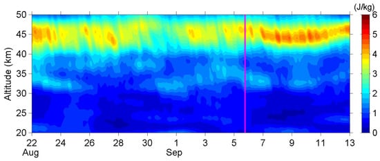 Figure 10. Altitudinal–temporal variation in AGW Ep in the stratospheric height range of 20 to 50 km over the EQ epicenter. A vertical magenta line marks the day of the EQ.