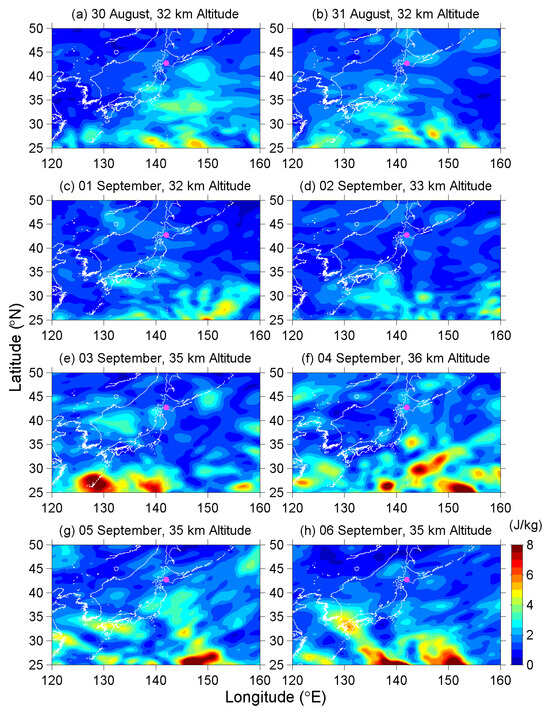 Figure 10 presents the AGW activity expressed as potential energy (Ep) from 22 August to 12 September, directly above the earthquake epicenter. A bright band of elevated Ep values appears near 45 km altitude, corresponding to the temperature inversion at the stratopause; this feature is not the focus here. Instead, attention is directed to another region of enhanced Ep between 32 and 35 km altitude. The AGW activity remained generally high throughout the period, except for a brief decrease between 26 and 29 August, and there is no clear evidence of enhanced AGW activity immediately before the earthquake. Figure 11 illustrates the daily variation in the spatial distribution of Ep activity in the height range of 32–35 km from 30 August to 6 September. AGWs are active around Japan during this period, but these waves are likely to be associated with meteorological phenomena. A cold front passed Hokkaido on 31 August, when another stationary front had remained around Japan for a long period from 24 August to 2 September. As mentioned earlier, a typhoon passed over western Japan on 4 September and subsequently transformed into an extratropical cyclone, while frontal systems redeveloped over Japan on 5 and 6 September. During the presumed earthquake preparation period, numerous convective weather systems were active around Japan, resulting in persistently high wave activity, as shown in Figure 9 and Figure 10. Consequently, meteorological influences during this time cannot be ruled out, making it difficult to determine whether any seismic effects were present. Even if such effects existed, they would likely have been minor compared with the dominant meteorological disturbances. Therefore, due to the intense weather activity—including the passage of a typhoon—no clear seismo-related AGW signatures were detected in the stratosphere, unlike those observed for the 2011 Tohoku earthquake [88] and the 2016 Kumamoto earthquake [89].