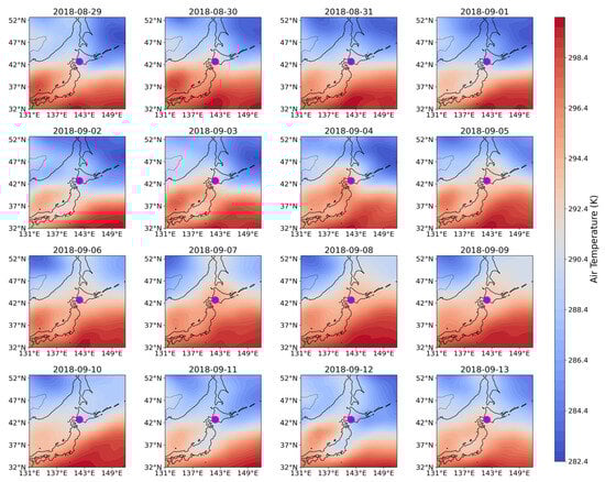 First, we show, in Figure 12, the daily residue plots of T about one week before and after the EQ (5 September). Redder in the figure means an increase in temperature, while more blue means a decrease in temperature. The EQ epicenter is indicated by a magenta circle. From 1 to 5 September, temperature patterns remain relatively stable across the Hokkaido area, with no significant anomalies visually apparent near the EQ epicenter.