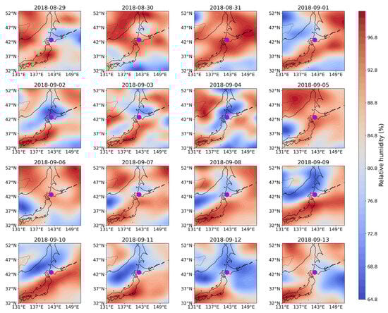 Then, Figure 13 is the corresponding results for RH for this EQ, which means that during the period of 29 August to 5 September, a noticeable reduction in RH is observed over the central and northern Hokkaido. This pre-seismic drying may be indicative of moisture divergence or suppressed atmospheric saturation.