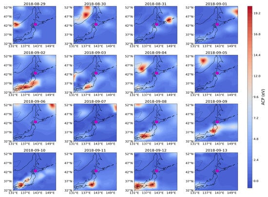 Then, ACP as a combinational function of T and RH in Figure 14 indicates elevated ACP values (above 14 eV) appear intermittently over Hokkaido and surrounding regions before the EQ, particularly on 30 August and 1 September (fair weather), suggesting unusual thermodynamic activity possibly associated with crust–atmosphere interactions.
