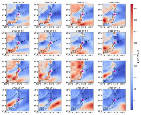 Figure 15 refers to the variation in SLHF. Elevated SLHF values (200–400 W/m2) are seen during 30 August to 1 September near the southern and coastal zones, including around the EQ epicenter, just before the EQ. This suggests a possible increase in latent heat release linked to enhanced evapotranspiration or subsurface vapor release. On 5 September (EQ day) and 6 September, there is a notable concentration of SLHF anomalies near the epicentral area. This might indicate atmospheric instability or localized energy redistribution due to tectonic stress release. Following the seismic event, SLHF values in the Hokkaido region decrease sharply, especially from 7 to 10 September, indicating a cooling and moisture loss phase possibly tied to reduced surface evaporation.