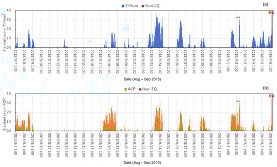 Figure 16. Ground-based monitoring of (a) T/RH (upper panel) and (b) ACP (lower panel) at a particular station of Tomakomai close to the EQ epicenter. The value on the ordinate means the detrended value normalized by standard deviation (σ).